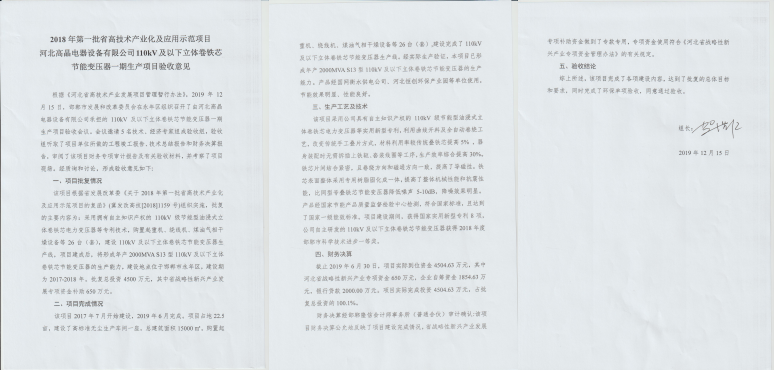 根據(jù)《河北省高技術(shù)產(chǎn)業(yè)發(fā)展項(xiàng)目管理暫行辦法》,2019年12月15日,邯鄲市發(fā)展和改革委員會在永年區(qū)組織召開了由河北高晶電器設(shè)備有限公司承擔(dān)的110kV及以下立體卷鐵心節(jié)能變壓器一期生產(chǎn)項(xiàng)目(年產(chǎn)2000MVA S13型110kV及以下立體卷鐵心節(jié)能變壓器)驗(yàn)收會。會議邀請技術(shù)、經(jīng)濟(jì)專家組成驗(yàn)收組,驗(yàn)收組聽取了項(xiàng)目工程竣工報(bào)告、技術(shù)總結(jié)報(bào)告和財(cái)務(wù)決算報(bào)告,審閱了財(cái)務(wù)專項(xiàng)審計(jì)報(bào)告及有關(guān)驗(yàn)收材料,并考察了項(xiàng)目現(xiàn)場。經(jīng)質(zhì)詢和討論,該項(xiàng)目完成了各項(xiàng)建設(shè)內(nèi)容,達(dá)到了批復(fù)的總體目標(biāo)和要求,同意通過驗(yàn)收。